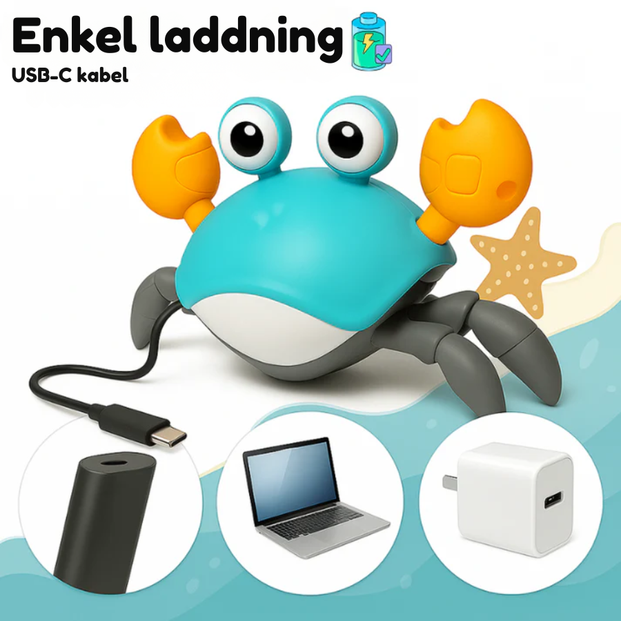 KrypKrabben laddas enkelt med USB-C kabel (ingår). En full laddning ger massor av lekstunder.